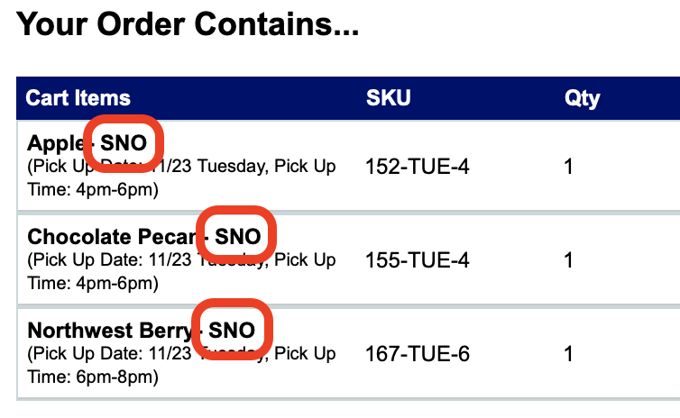 A: Your pick-up location is denoted two places 1) At the top of your order confirmation and 2) Next to the name of the pie you purchased. If your order says SNO you're picking up from our Snohomish location. If your order says MLT, you're picking up from our Mountlake Terrace location.